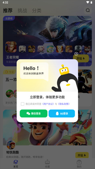 2、在首页点击发现这里,有着丰富的游戏推荐,如原神、王者荣耀、地铁跑酷等等
