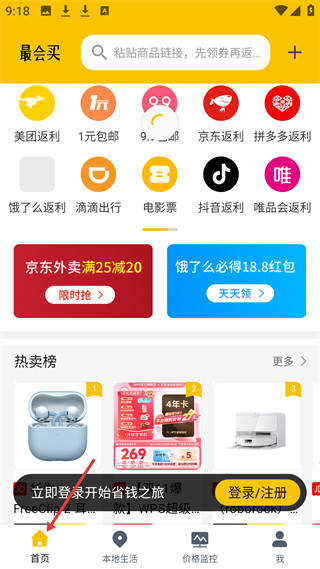 2、首页有搜索栏可粘贴商品链接领券返利,有美团返利、1元包邮等功能入口,还有京东外卖满减、饿了么红包活动展示热卖商品榜。