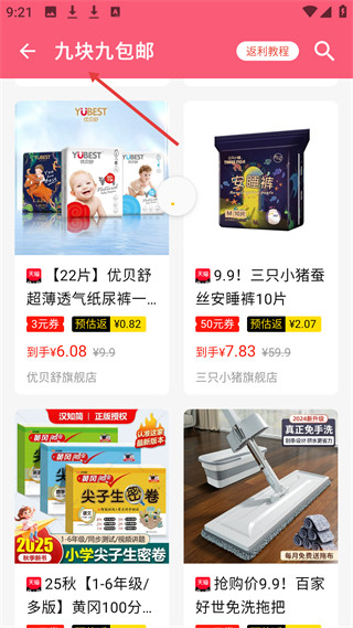 3、九块九包邮板块,展示优贝舒纸尿裤、三只小猪安睡裤等商品,标注优惠券、预估返利及到手价,方便用户低价选购。