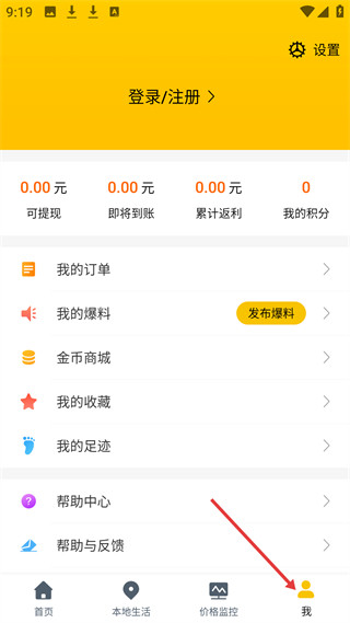 4、我的页面可登录注册,显示可提现、即将到账等金额及积分,有我的订单、我的爆料等功能,还能发布爆料查询帮助信息。