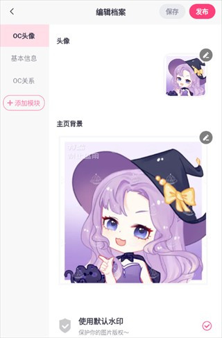 4、精美主页设计和水印保护功能,展现OC个性魅力的同时保障用户创作权利。