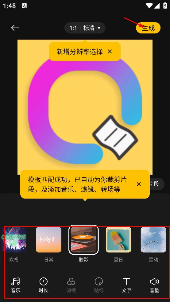 4、在成片编辑页面可设置模板、音乐等,然后点击生成,完成快速成片操作。