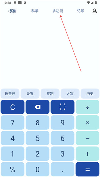 1、打开超级计算器APP,点击上方多功能选项,进入多功能功能页面。
